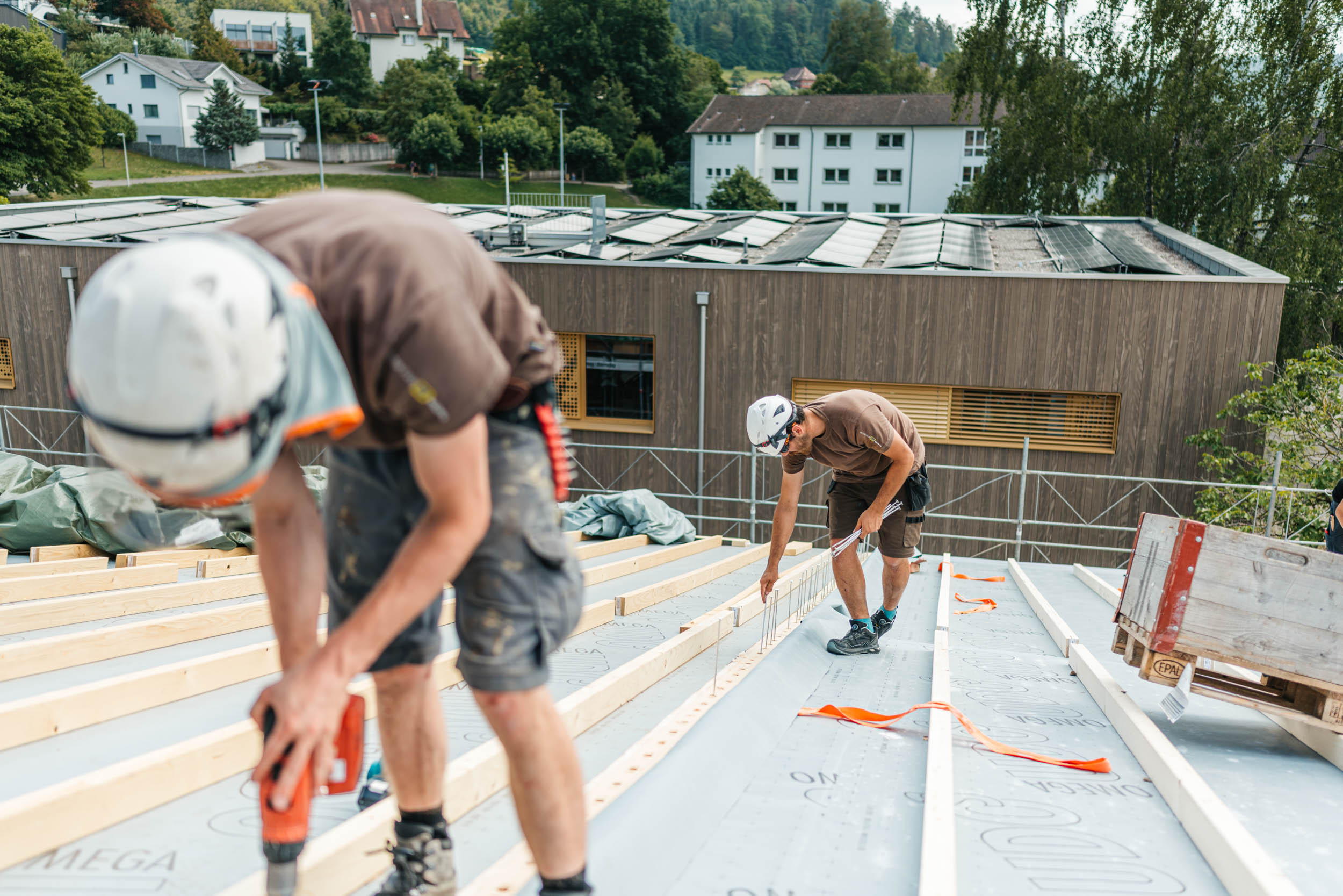 Heutzutage werden die Balken aus Konstruktionsholz und Brettschichtholz auf der CNC-gesteuerten Abbundmaschine mit präzisen Fräsungen versehen, dank derer sie sich zum Tragwerk verbinden lassen. Verschiedene kraftschlüssige Verbindungen von Holz zu Holz (Schwalbenschwanz etc.) sorgen dafür, dass einwirkende Trag-, Zug-, und Scherkräfte von dem einen auf das andere Bauteil übertragen werden und so äusserst leichte, tragfähige Tragwerkstrukturen gebaut werden können. Für Tragwerke, die grössere Distanzen überspannen, bietet der Holzbau auch Lösungen mit gebogenen Bindern.
